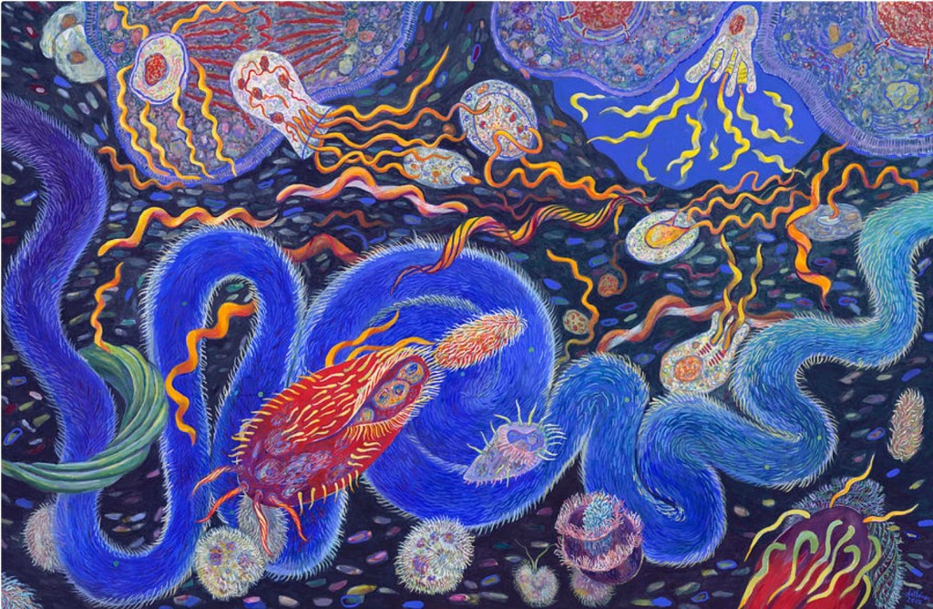 This involves creating ecosystems where often overlooked entities, like microbes, fungi, and biomechanical organisms, become central figures.